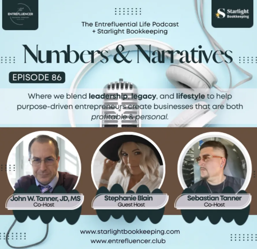 Each section corresponds to one episode from the Numbers & Narratives series — a collaboration between hosts John W. Tanner, JD, MS, Sebastian Tanner, and Stephanie Blain, founder of Starlight Bookkeeping.